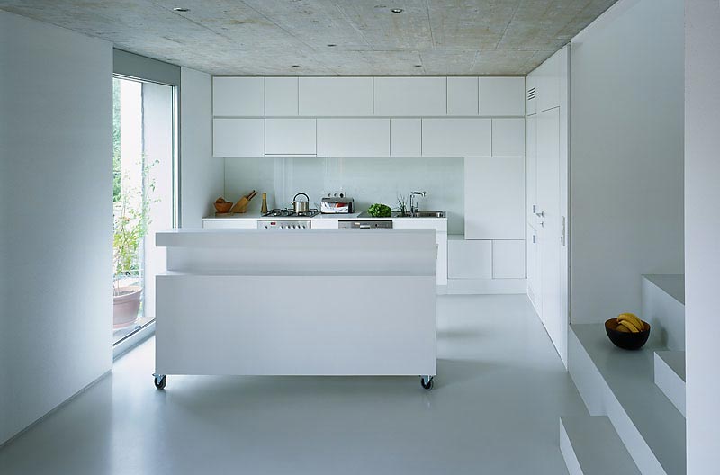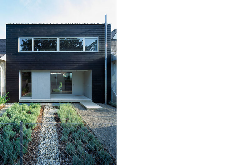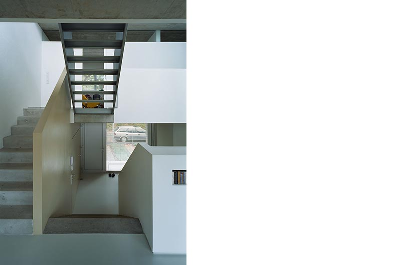 Im Kontext der Reihenhausbebauung folgt der Entwurf auch in seiner Außengestalt exakt dem gesetzlichen Umriss, weist aber im Inneren eine komplexe räumliche Struktur auf, welche vor allem die Belichtung im Reihenhaus thematisiert.