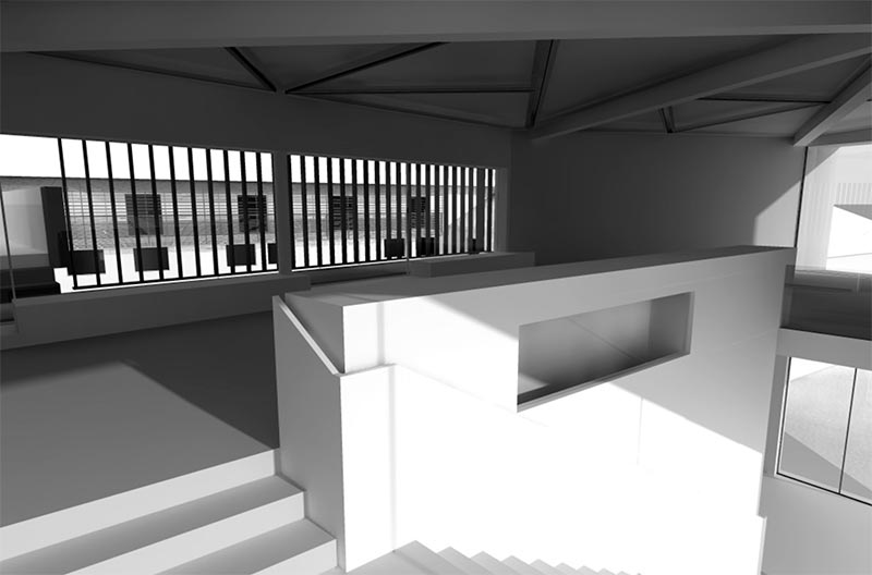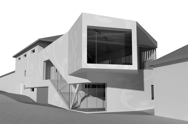 Im nicht unterkellerten Zubau werden im Erdgeschoss Verkaufsräumen und ein Büro, im Obergeschoss der Verkostungssalon, das Office und Sanitärräume angeordnet. Dem Verkostungsraum vorgelagert ist die südseitige verandaartige Terrasse. Von dieser gelangt man auf ein zweite kleinere Terrasse über den bestehenden Ausfahrtstoren des Lagertraktes