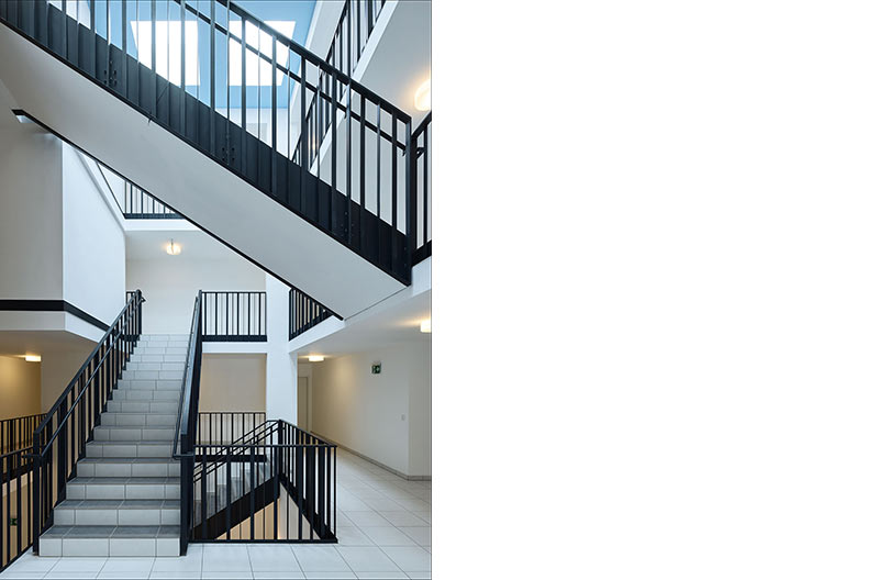 Im Bauteil 1 dient das Erschließungsatrium als Kommunikationszone, es verbindet alle Geschosse und erlaubt Blickbeziehungen vom Dachgeschoß bis in den Keller. Die Wohnungen gruppieren sich um dieses großzügige, natürlich belichtete Atrium.