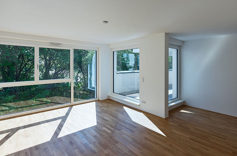 Die wohnungsbezogenen Freiräume werden als in den Baukörper eingeschnittene Loggien angeboten und weisen dadurch eine hohe Privatheit auf. Die Wohnungen sind Ost-West orientiert und werden durch die raumhohen Verglasungen hell und sonnig und bieten ein modernes Raumgefühl. An der ostseitigen Baulinie sind im Erdgeschoss ein grosser Fahrradraum mit Werkstatt und der Arbeits- Atelierbereich der zweigeschossige Wohnung angeordnet.