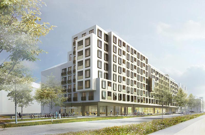 Um dieser besonderen Lage zu entsprechen wird ein ruhiger und selbstbewusster Baukörper mit leichter Höhenstaffelung zum Platz und einer Längengliederung mit Gebäudefugen entwickelt. Wesentlich ist die Unterscheidung in Stadtfassade und Platzfassade.