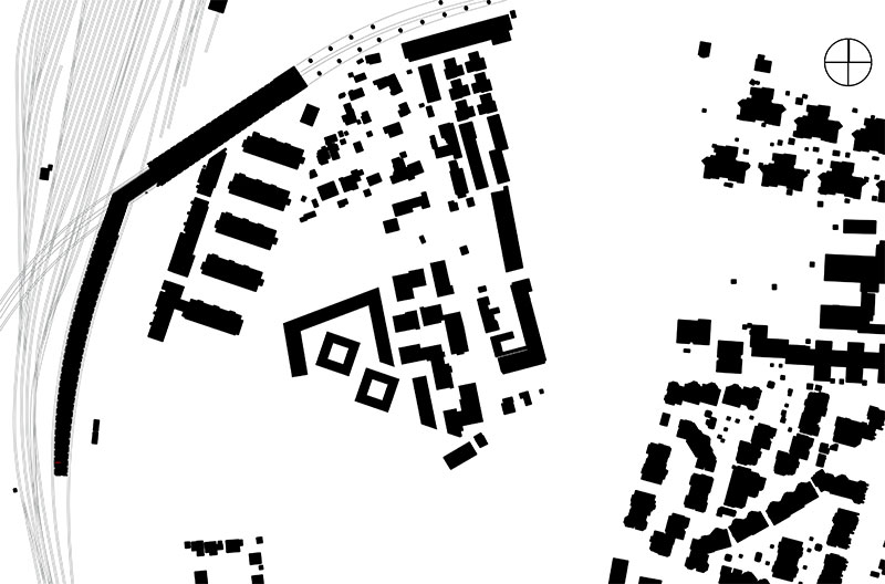 Die Struktur der Siedlung ist geprägt durch das Zusammenspiel von Gebäuden und Plätzen: Neun Wohnhäuser und drei Plätze sind durch eine Sequenz aus Gassen, Wegen und kleineren Plätzen miteinander verbunden, umgeben von einer modellierten Gebäudesilhouette.
