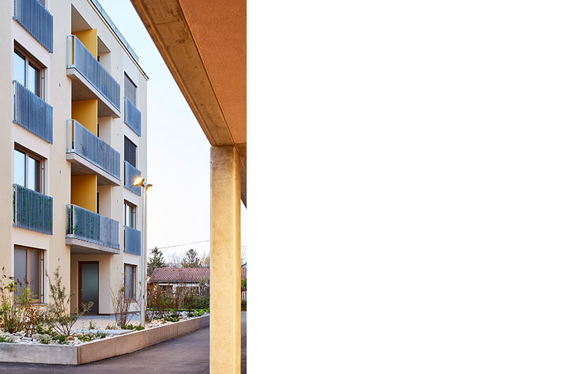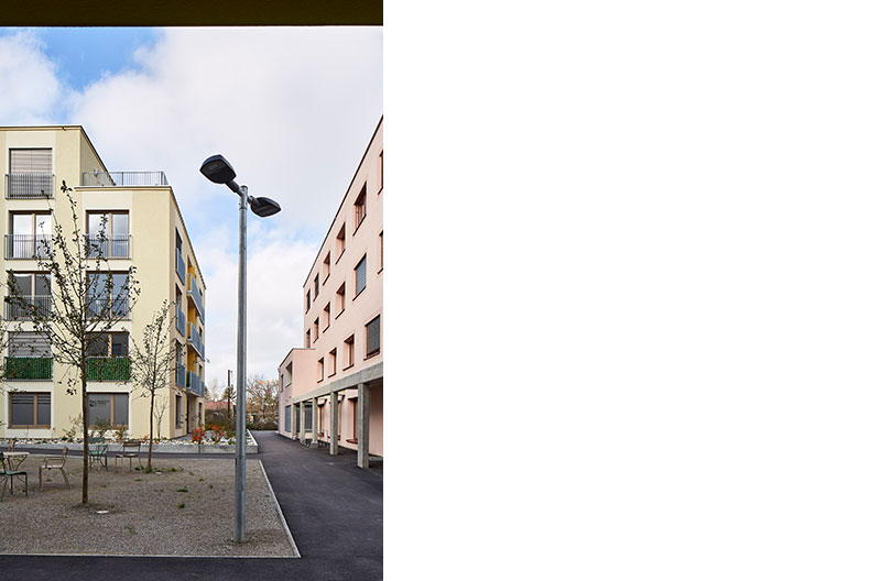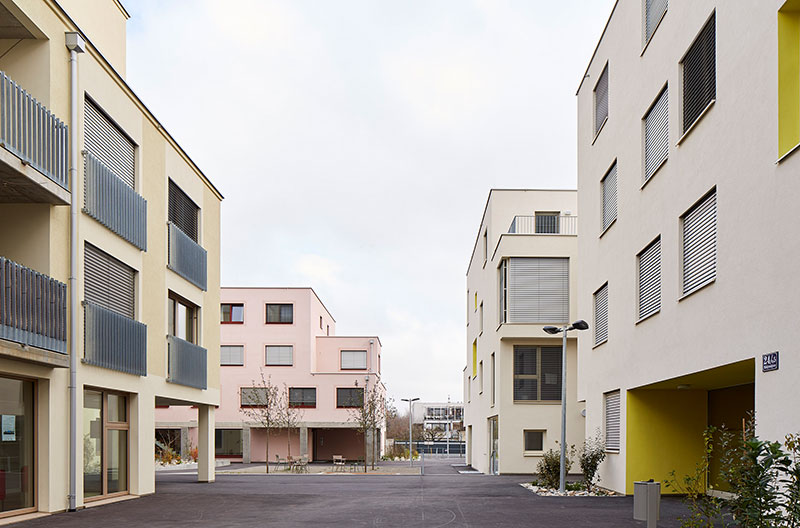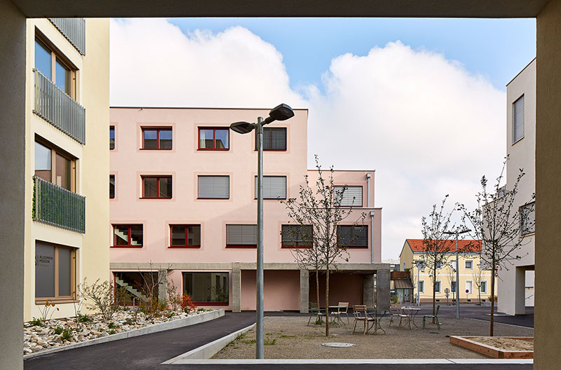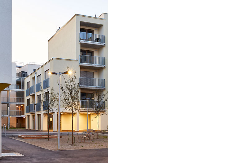 Der Außenraum der Gebäude ist der urbane Innenraum der Siedlung. Der Wohnraum erweitert sich also konzeptionell um den Siedlungsinnenraum. Dieser soll auch von den Bewohnerinnen und Bewohnern genutzt werden, indem das Motto der essbaren Stadt mit Freiraumbepflanzung, wie etwa Hochbeeten und einer Gemeinschaftsgartenanlage, und der Möblierung der Plätze umgesetzt wird. Dadurch werden auch übergreifende Nachbarschaften ermöglicht.