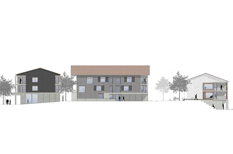 Eine der Hauptqualitäten beim Areal der Ortsmitte ist die leicht erhöhte verbindende und zentrale Lage. In einem durch den Verkehr stark belasteten Umfeld wird durch die Implementierung einer ensemblebildenden Platzsequenz aus dem scheinbaren Nachteil ein Mehrwert. Die Klare Adressierung der einzelnen Bausteine des Gesamtensembles führt zu einer eindeutigen Erkennbarkeit und Identität. Die Platzfolge aus Marktplatz, Quartierplatz und Vorplatz ist das Instrument für die Bildung eines gemeinsamen Ensembles. Die Platzräume sind den jeweiligen städtischen Anforderungen/Aufgaben zugeordnet. Der Marktplatz an der Staudacher Straße bildet den städtischen gesellschaftlichen Raum für Versammlungen und Veranstaltungen. Durch seine Lage und die Verlegung der Parkplätze erzeugt er eine verkehrsfreie Fläche für alle denkbaren städtischen Nutzungen.