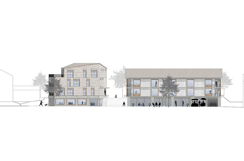 Der markante Stadtbaustein an der Arenastiege begrenzt den Marktplatz im Süden und zoniert einen zusätzlichen südlichen Gastgarten für das Cafe. Das zum Marktplatz und Garten durchgesteckte Lokal ermöglicht die Mitnutzung der Außenbereiche zum Markt und zum Gastgarten.